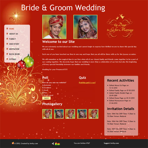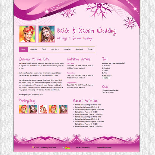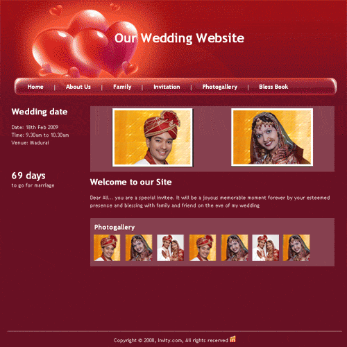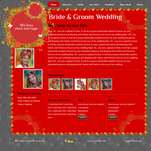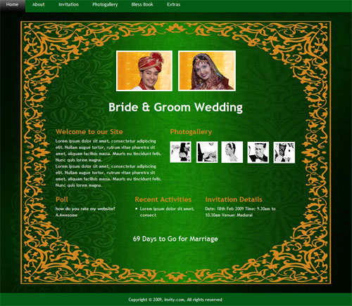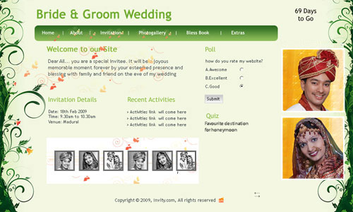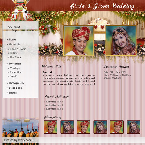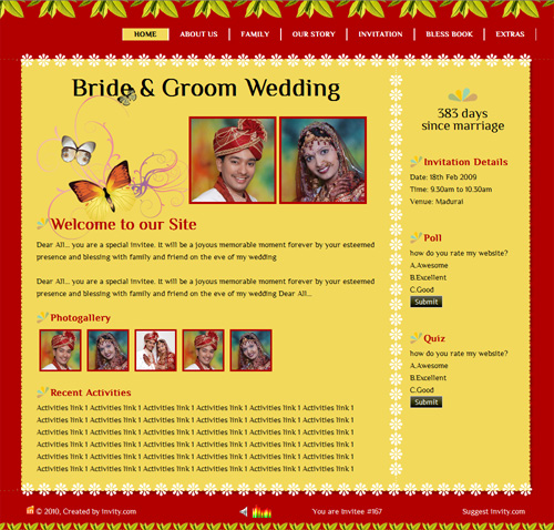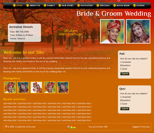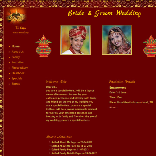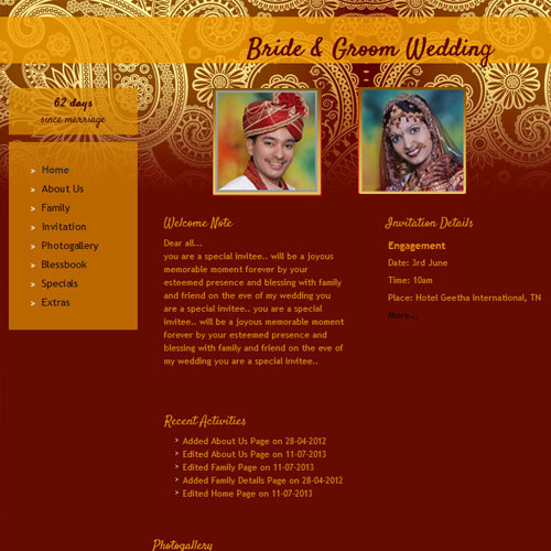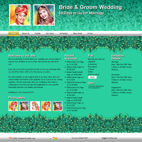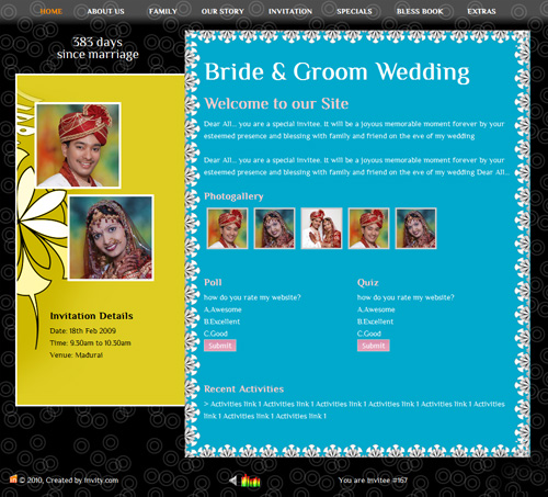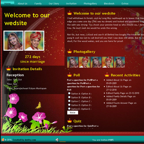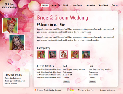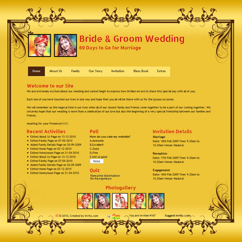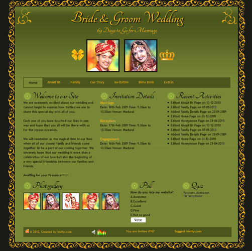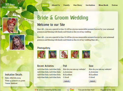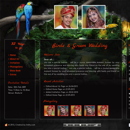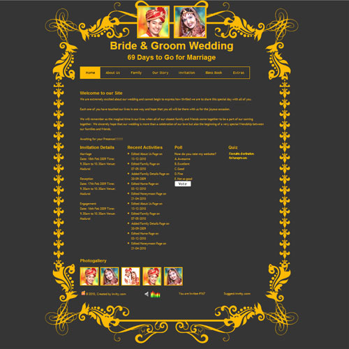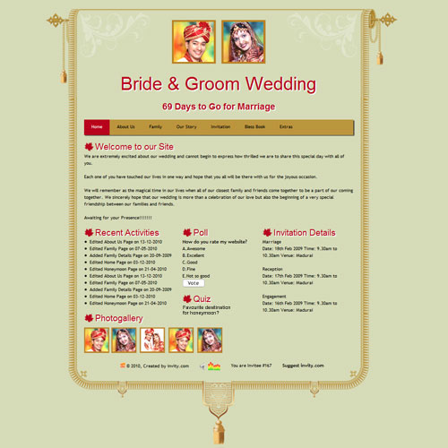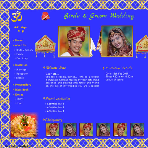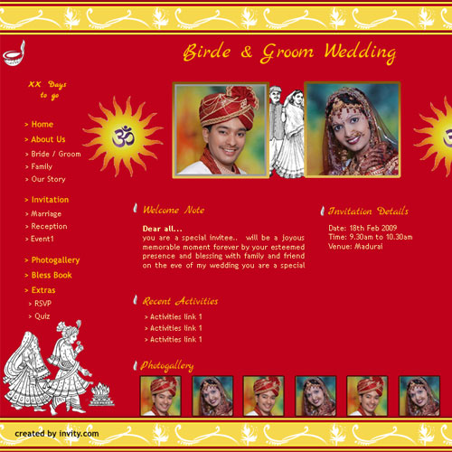 A marriage is a beautiful occasion that we want to share with the world. What better way can there be than to do it online through your own wedding website?. invity.com is a wedding website platform with many beautiful themes to choose from, so that you can create your own personalised Indian ethnic online wedding invitation for inviting all your guest.